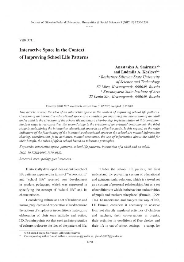 Библиографическое описание: Smirnaia, Anastasiya. Interactive Space in the Context of Improving School Life Patterns = Интерактивное пространство в контексте совершенствования уклада школьной жизни / A. A. Smirnaia, L. A. Kozlova. - Текст : непосредственный // Журнал Сибирского федерального университета. Гуманитарные науки. - 2017. - Т. 10, № 8. - С. 1250-1258. - Библиогр.: с. 1257-1258. - ISSN 1997-1370.