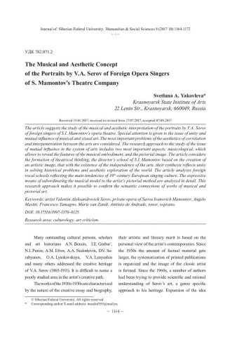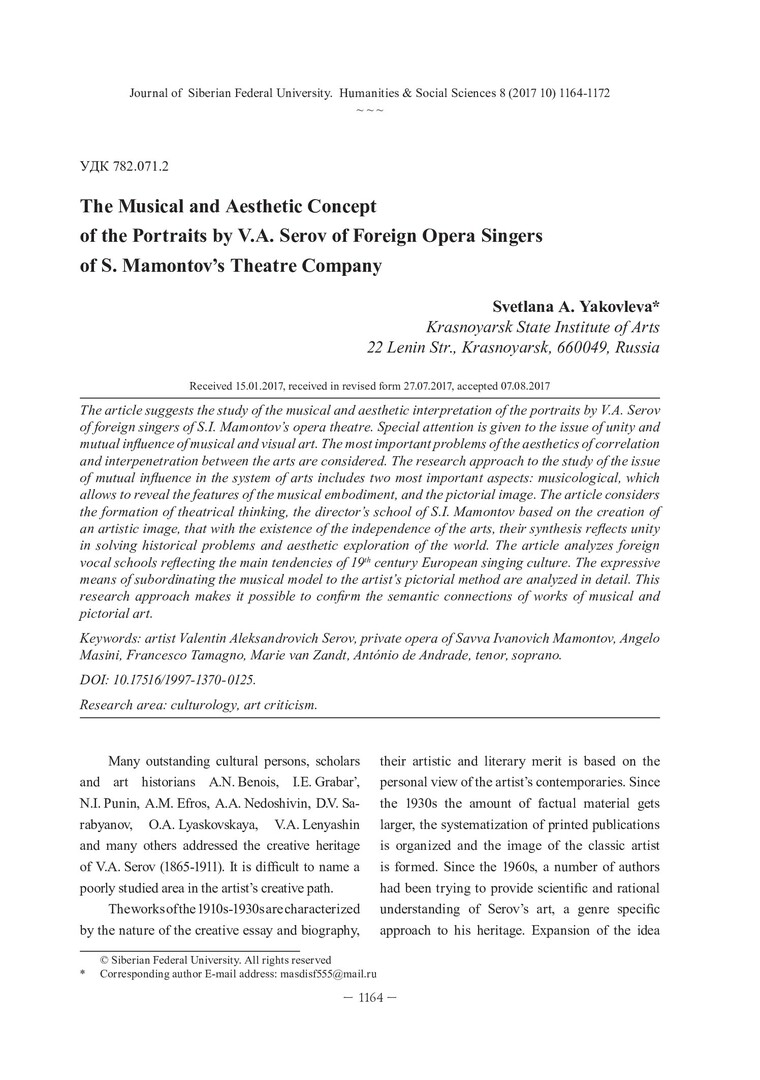 Библиографическое описание:Yakovleva, Svetlana. The Musical and Aesthetic Concept of the Portraits by V. A. Serov of Foreign Opera Singers of S. Mamontov`s Theatre Company = Музыкально-эстетическая концепция портретов В. А. Серова зарубежных оперных певцов труппы театра С. Мамонтова / S. A. Yakovleva. - Текст : непосредственный // Журнал Сибирского федерального университета. Гуманитарные науки. - 2017. - Т. 10, № 8. - С. 1164-1172. - Библиогр.: с. 1171-1172. - ISSN 1997-1370.