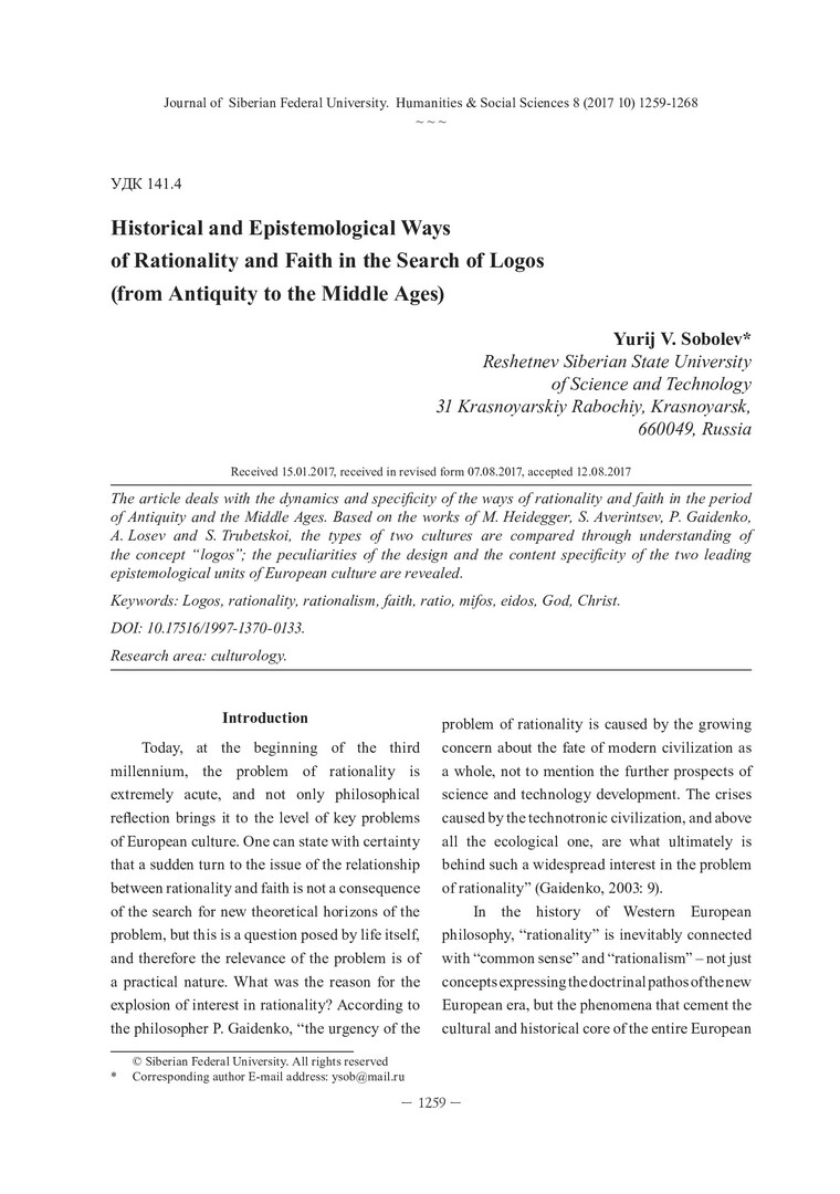 Библиографическое описание:Sobolev, Yurij. Historical and Epistemological Ways of Rationality and Faith in the Search of Logos (from Antiquity to the Middle Ages) = Историко-гносеологические пути рациональности и веры в поисках логоса (от Античности до Средневековья) / Yu. V. Sobolev. - Текст : непосредственный // Журнал Сибирского федерального университета. Гуманитарные науки. - 2017. - Т. 10, № 8. - С. 1259-1268. - Библиогр.: с. 1267-1268. - ISSN 1997-1370.