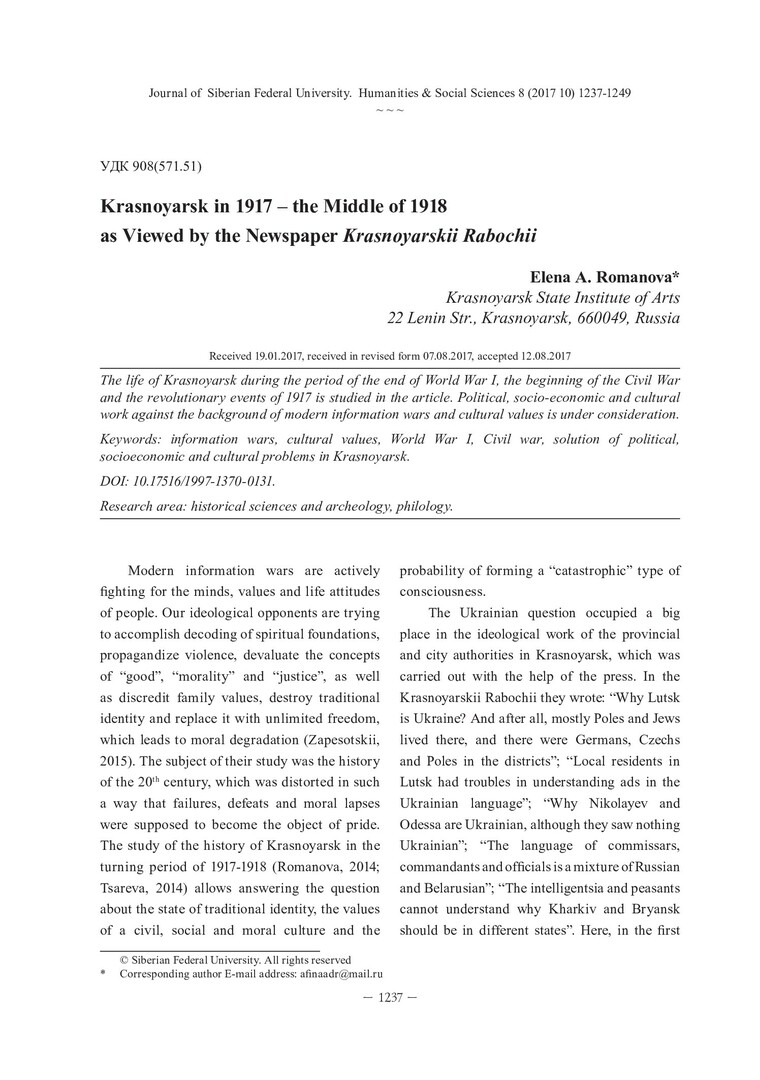 Библиографическое описание:Romanova, Elena. Krasnoyarsk in 1917 – the Middle of 1918 as Viewed by the Newspaper Krasnoyarskii Rabochii = Красноярск в 1917 – середине 1918 гг. глазами газеты "Красноярский рабочий" / E. A. Romanova. - Текст : непосредственный // Журнал Сибирского федерального университета. Гуманитарные науки. - 2017. - Т. 10, № 8. - С. 1237-1249. - Библиогр.: с. 1249. - ISSN 1997-1370.