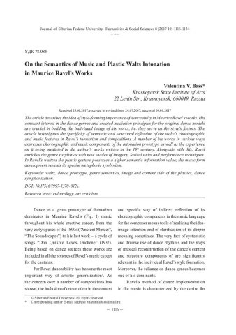 Библиографическое описание:Bass, Valentina. On the Semantics of Music and Plastic Walts Intonation in Maurice Ravel`s Works = О семантике музыкально-пластической интонации вальса в произведениях Мориса Равеля / V. V. Bass. - Текст : непосредственный // Журнал Сибирского федерального университета. Гуманитарные науки. - 2017. - Т. 10, № 8. - С. 1116-1134. - Библиогр.: с. 1133-1134. - ISSN 1997-1370.