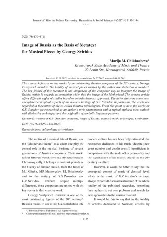 Библиографическое описание:Chikhacheva, Marija. Image of Russia as the Basis of Metatext for Musical Pieces by Georgy Sviridov = Образ России как основа метатекста музыкального творчества Георгия Свиридова / M. M. Chikhacheva. - Текст : непосредственный // Журнал Сибирского федерального университета. Гуманитарные науки. - 2017. - Т. 10, № 8. - С. 1135-1144. - Библиогр.: с. 1142-1144. - ISSN 1997-1370.