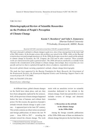 Библиографическое описание:Reznikova, Ksenia. Historiographycal Review of Scientific Researches on the Problem of People`s Perception of Climate Change = Историографический обзор научных исследований по проблеме отношения населения к изменениям климата / K. V. Reznikova, Yu. S. Zamaraeva. - Текст : непосредственный // Журнал Сибирского федерального университета. Гуманитарные науки. - 2017. - Т. 10, № 9. - С. 1396-1415. - Библиогр.: с. 1407-1415. - ISSN 1997-1370.