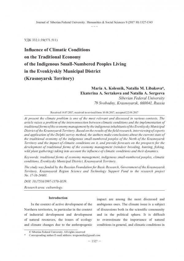 Библиографическое описание:Influence of Climatic Conditions on the Traditional Economy of the Indigenous Small-Numbered Peoples Living in the Evenkiyskiy Municipal District (Krasnoyarsk Territory) = Влияние климатических условий на традиционную экономику коренных малочисленных народов, проживающих в Эвенкийском муниципальном районе (Красноярский край) / M. A. Kolesnik [и др.]. - Текст : непосредственный // Журнал Сибирского федерального университета. Гуманитарные науки. - 2017. - Т. 10, № 9. - С. 1327-1343. - Библиогр.: с. 1337-1343. - ISSN 1997-1370.