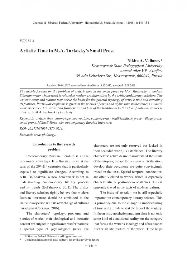 Библиографическое описание:Valianov, Nikita. Artistic Time in M.A. Tarkosky`s Small Prose = Художественное время в малой прозе М.А. Тарковского / N. A. Valianov. - Текст : непосредственный // Журнал Сибирского федерального университета. Гуманитарные науки. - 2018. - Т. 11, № 1. - С. 146-154. - Библиогр.: с. 152-154. - ISSN 1997-1370.