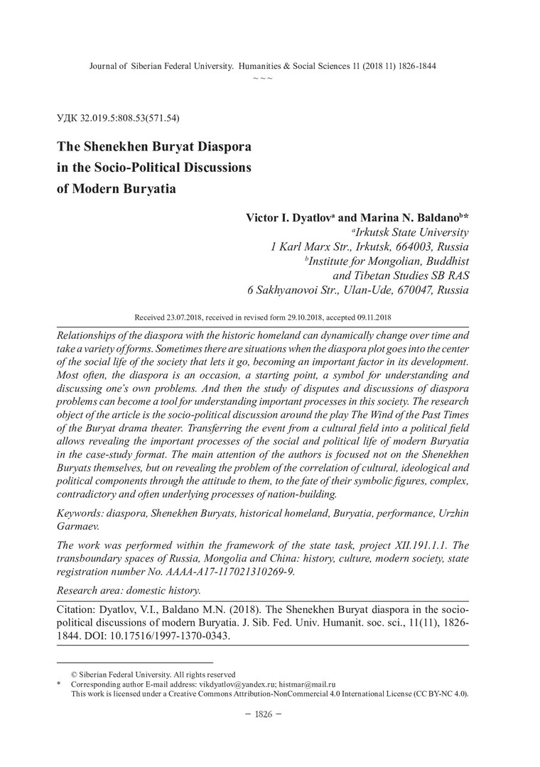 Библиографическое описание:Dyatlov, Victor. The Shenekhen Buryat Diaspora in the Socio-Political Discussions of Modern Buryatia = Диаспора шэнэхэнских бурят в общественно-политических дискуссиях современной Бурятии / V. I. Dyatlov, M. N. Baldano. - Текст : непосредственный // Журнал Сибирского федерального университета. Гуманитарные науки. - 2018. - Т. 11, № 11. - С. 1826-1844. - Библиогр.: с. 1841-1844. - ISSN 1997-1370.