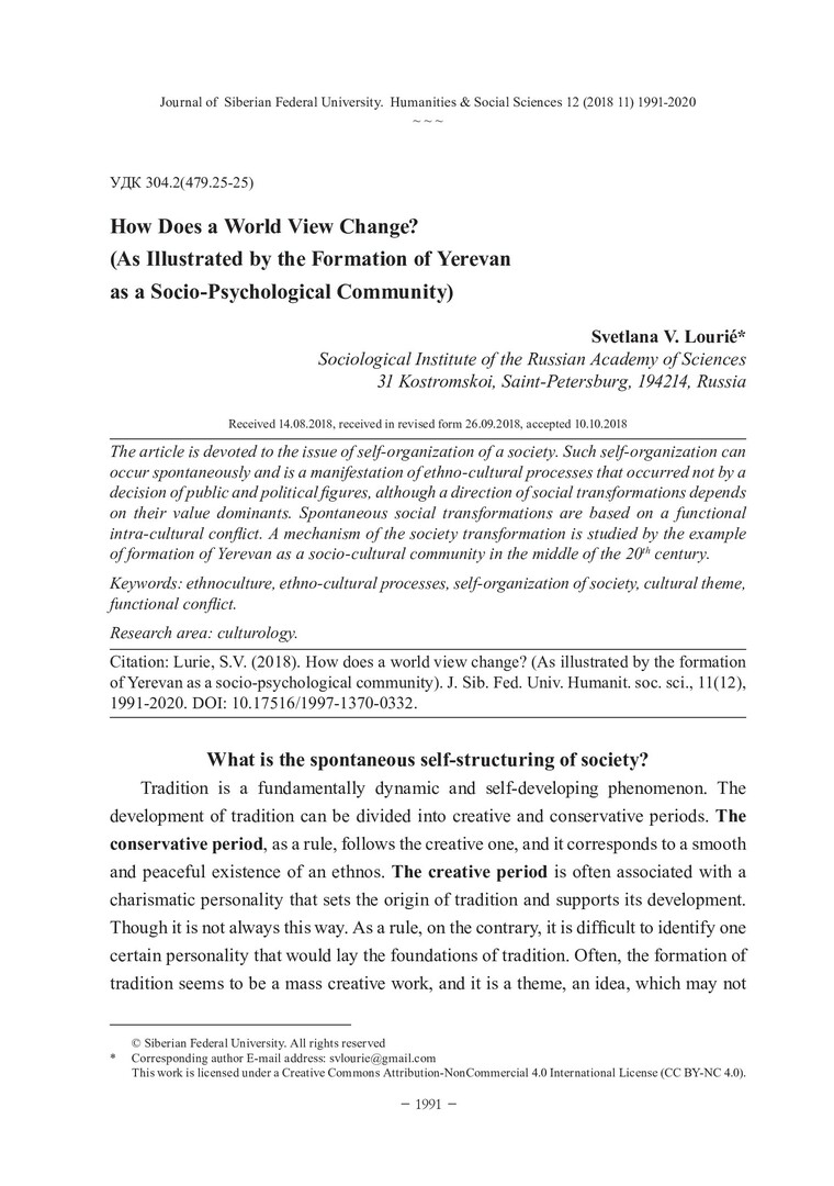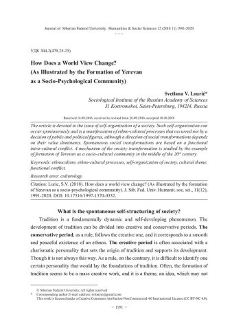 Библиографическое описание:Lourie, Svetlana. How Does a World View Change? (As Illustrated by the Formation of Yerevan as a Socio-Psychological Community) = Как меняется картина мира? (На примере формирования Еревана как социально-психологической общности) / S. V. Lourie. - Текст : непосредственный // Журнал Сибирского федерального университета. Гуманитарные науки. - 2018. - Т. 11, № 12. - С. 1991-2020. - Библиогр.: с. 2018-2020. - ISSN 1997-1370.