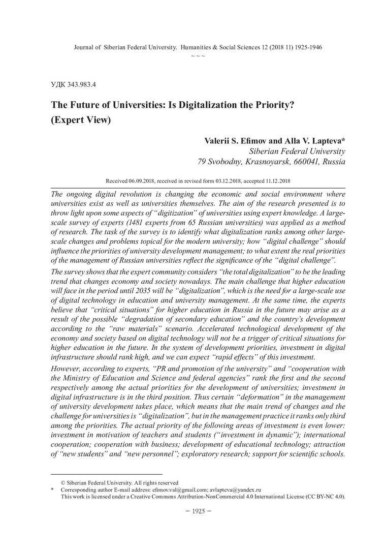 Библиографическое описание:Efimov, Valerii. The Future of Universities: Is Digitalization the Priority? (Expert View) = Будущее университетов: приоритет цифровизации? (Экспертный взгляд) / A. V. Laptevа, V. S. Efimov. - Текст : непосредственный // Журнал Сибирского федерального университета. Гуманитарные науки. - 2018. - Т. 11, № 12. - С. 1925-1946. - Библиогр.: с. 1944-1946. - ISSN 1997-1370.