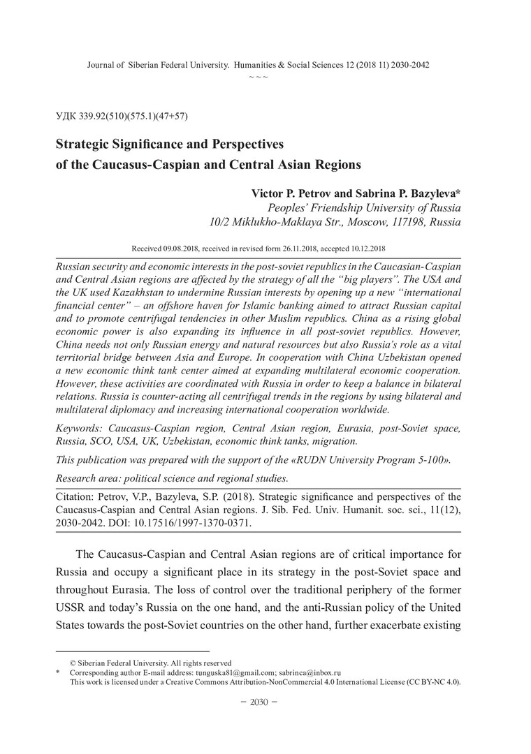 Библиографическое описание:Petrov, Victor. Strategic Significance and Perspectives of the Caucasus-Caspian and Central Asian Regions = Стратегическая значимость и перспективы Кавказско-Каспийского и Центрально-Азиатского регионов / V. P. Petrov, S. P. Bazyleva. - Текст : непосредственный // Журнал Сибирского федерального университета. Гуманитарные науки. - 2018. - Т. 11, № 12. - С. 2030-2042. - Библиогр.: с. 2039-2042. - ISSN 1997-1370.