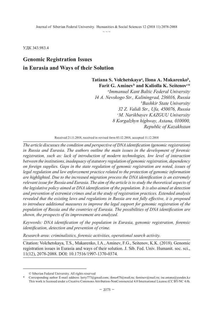 Библиографическое описание:Genomic Registration Issues in Eurasia and Ways of their Solution = Проблемы геномной регистрации в Eвразии и пути их решения / T. S. Volchetskaya [и др.]. - Текст : непосредственный // Журнал Сибирского федерального университета. Гуманитарные науки. - 2018. - Т. 11, № 12. - С. 2078-2088. - Библиогр.: с. 2084-2088. - ISSN 1997-1370.