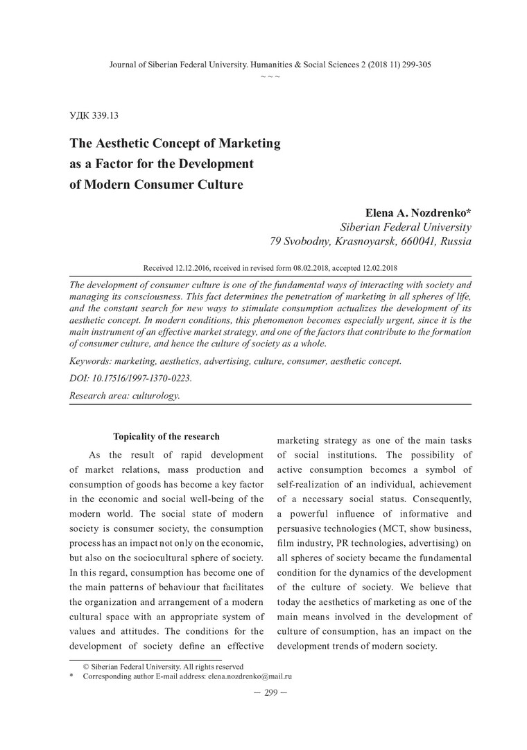 Библиографическое описание:Nozdrenko, Elena. The Aesthetic Concept of Marketing as a Factor for the Development of Modern Consumer Culture = Эстетический концепт маркетинга как фактор формирования современной потребительской культуры / E. A. Nozdrenko. - Текст : непосредственный // Журнал Сибирского федерального университета. Гуманитарные науки. - 2018. - Т. 11, № 2. - С. 299-305. - Библиогр.: с. 304-305. - ISSN 1997-1370.