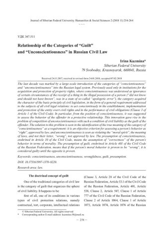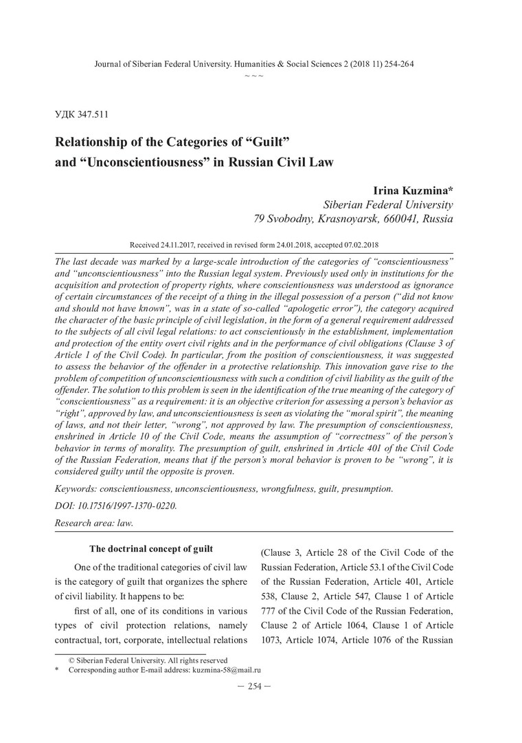 Библиографическое описание: Kuzmina, Irina. Relationship of the Categories of "Guilt" and "Unconscientiousness" in Russian Civil Law = Соотношение категорий "вина" и "недобросовестность" в российском гражданском праве / I. Kuzmina. - Текст : непосредственный // Журнал Сибирского федерального университета. Гуманитарные науки. - 2018. - Т. 11, № 2. - С. 254-264. - Библиогр.: с. 262-264. - ISSN 1997-1370.