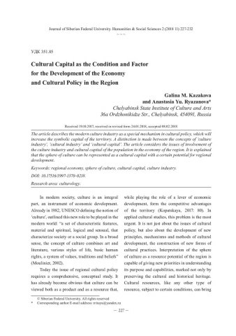Библиографическое описание:Kazakova, Galina. Cultural Capital as the Condition and Factor for the Development of the Economy and Cultural Policy in the Region = Культурный капитал как условие и фактор развития экономики и культурной политики региона / G. M. Kazakova, A. Yu. Ryazanova. - Текст : непосредственный // Журнал Сибирского федерального университета. Гуманитарные науки. - 2018. - Т. 11, № 2. - С. 227-232. - Библиогр.: с. 231-232. - ISSN 1997-1370.