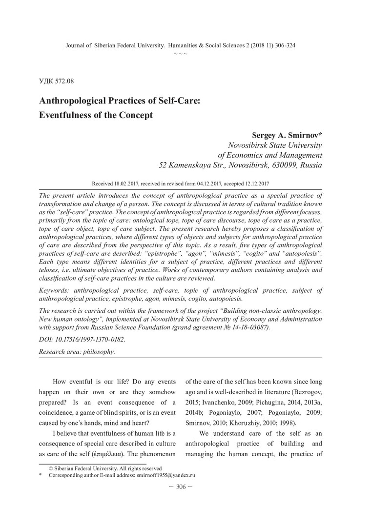 Библиографическое описание:Smirnov, Sergey. Anthropological Practices of Self-Care: Eventfulness of the Concept = Антропопрактики заботы о себе: событийность концепта / S. A. Smirnov. - Текст : непосредственный // Журнал Сибирского федерального университета. Гуманитарные науки. - 2018. - Т. 11, № 2. - С. 306-324. - Библиогр.: с. 321-324. - ISSN 1997-1370.