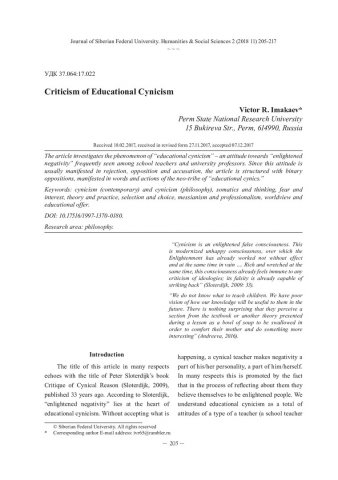 Библиографическое описание:Imakaev, Victor. Criticism of Educational Cynicism = Критика педагогического цинизма / V. R. Imakaev. - Текст : непосредственный // Журнал Сибирского федерального университета. Гуманитарные науки. - 2018. - Т. 11, № 2. - С. 205-217. - Библиогр.: с. 216-217. - ISSN 1997-1370.