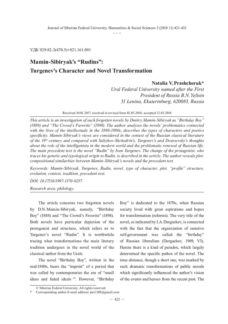 Библиографическое описание:Prashcheruk, Natalia. Mamin-Sibiryak’s "Rudins": Turgenev`s Character and Novel Transformation = "Рудины" Д.Н. Мамина-Сибиряка: трансформации тургеневского героя и романа / N. V. Prashcheruk. - Текст : непосредственный // Журнал Сибирского федерального университета. Гуманитарные науки. - 2018. - Т. 11, № 3. - С. 421-432. - Библиогр.: с. 431-432. - ISSN 1997-1370.