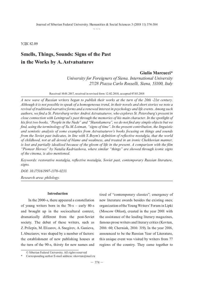 Библиографическое описание:Marcucci, Giulia. Smells, Things, Sounds: Signs of the Past in the Works by A. Astvatsaturov = Запахи, вещи, звуки: знаки прошлого в произведениях А. Аствацатурова / G. Marcucci. - Текст : непосредственный // Журнал Сибирского федерального университета. Гуманитарные науки. - 2018. - Т. 11, № 3. - С. 374-384. - Библиогр.: с. 383-384. - ISSN 1997-1370.