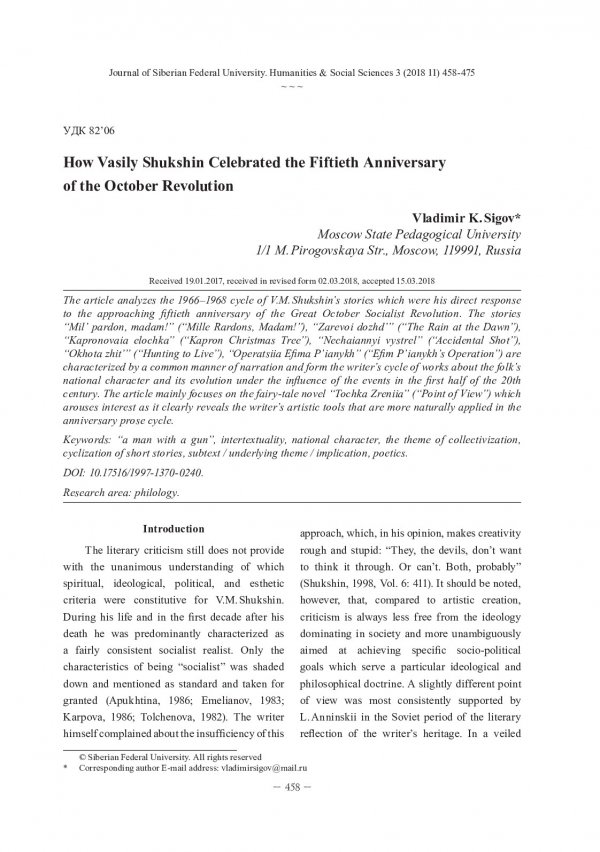 Библиографическое описание:Sigov, Vladimir. How Vasily Shukshin Celebrated the Fiftieth Anniversary of the October Revolution = Как Василий Шукшин отметил пятидесятилетие Октября / V. K. Sigov. - Текст : непосредственный // Журнал Сибирского федерального университета. Гуманитарные науки. - 2018. - Т. 11, № 3. - С. 458-475. - Библиогр.: с. 474-475. - ISSN 1997-1370.