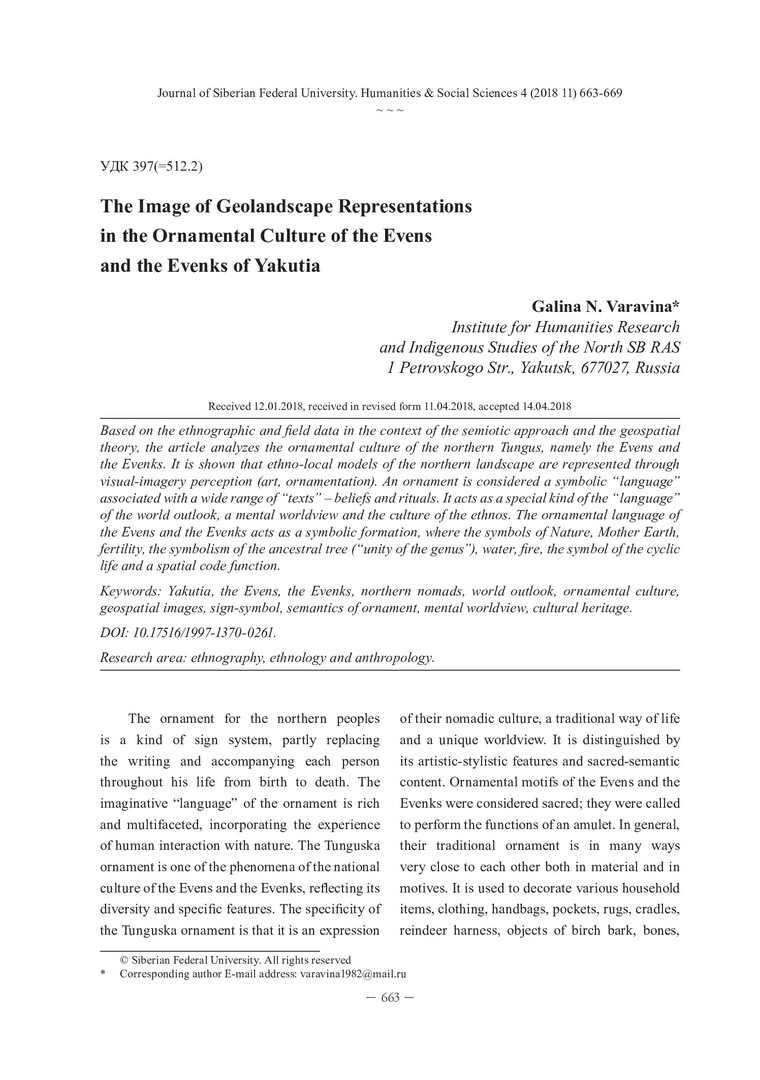 Библиографическое описание:Varavina, Galina. The Image of Geolandscape Representations in the Ornamental Culture of the Evens and the Evenks of Yakutia = Образ геоландшафтных представлений в орнаментальной культуре эвенов и эвенков Якутии / G. N. Varavina. - Текст : непосредственный // Журнал Сибирского федерального университета. Гуманитарные науки. - 2018. - Т. 11, № 4. - С. 663-669. - Библиогр.: с. 668-669. - ISSN 1997-1370.