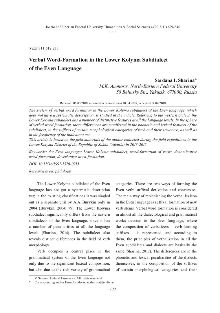 Библиографическое описание:Sharina, Sardana. Verbal Word-Formation in the Lower Kolyma Subdialect of the Even Language = Глагольное словообразование в нижнеколымском говоре эвенского языка / S. I. Sharina. - Текст : непосредственный // Журнал Сибирского федерального университета. Гуманитарные науки. - 2018. - Т. 11, № 4. - С. 629-640. - Библиогр.: с. 639-640. - ISSN 1997-1370.