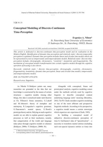 Аннотация:Описывается модель континуально-дискретного восприятия времени и рассматривается ее репрезентация в современном английском языке. Обосновывается выделение динамичного и условно статичного (дискретного) восприятия времени. При динамичном восприятии времени возможна реализация линейной и циклической, темперостатичной и темперодинамичной моделей.