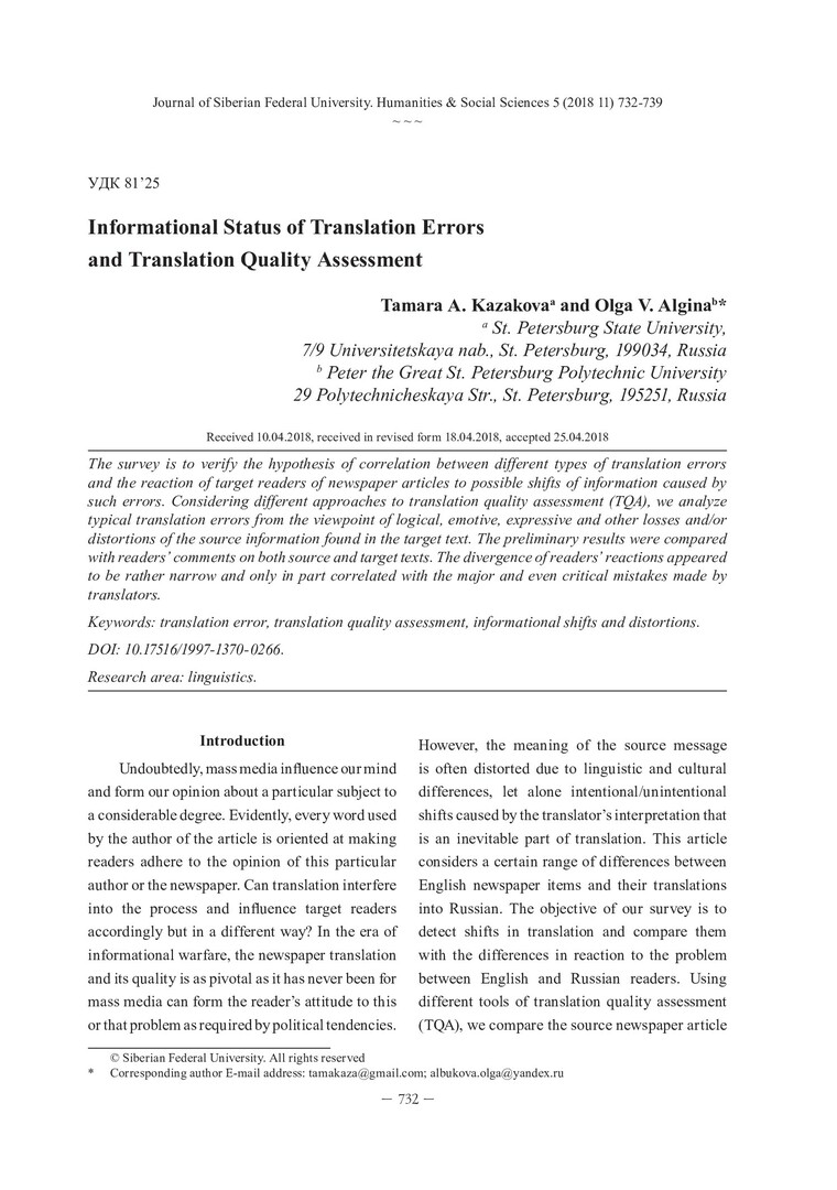 Библиографическое описание:Kazakova, Tamara. Informational Status of Translation Errors and Translation Quality Assessment = Информационный статус переводческих ошибок и оценка качества перевода / T. A. Kazakova, O. V. Algina. - Текст : непосредственный // Журнал Сибирского федерального университета. Гуманитарные науки. - 2018. - Т. 11, № 5. - С. 732-739. - Библиогр.: с. 738-739. - ISSN 1997-1370.