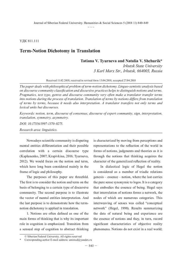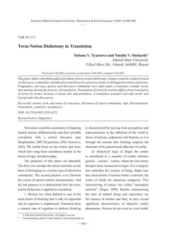 Библиографическое описание:Tyurneva, Tatiana. Term-Notion Dichotomy in Translation = Дихотомия термин-понятие: переводческий аспект / T. V. Tyurneva, N. V. Shchurik. - Текст : непосредственный // Журнал Сибирского федерального университета. Гуманитарные науки. - 2018. - Т. 11, № 5. - С. 840-849. - Библиогр.: с. 848-849. - ISSN 1997-1370.