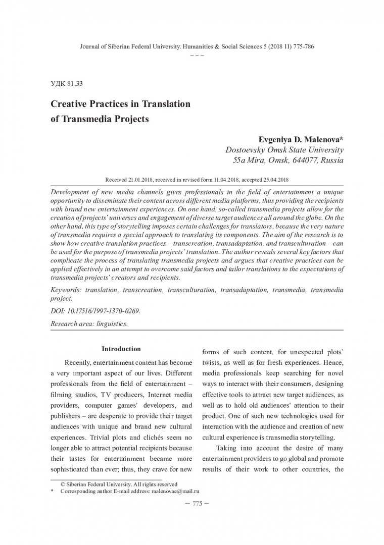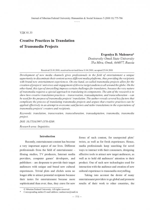 Библиографическое описание:Malenova, Evgeniya. Creative Practices in Translation of Transmedia Projects = Креативные практики в переводе трансмедийных проектов / E. D. Malenova. - Текст : непосредственный // Журнал Сибирского федерального университета. Гуманитарные науки. - 2018. - Т. 11, № 5. - С. 775-786. - Библиогр.: с. 784-786. - ISSN 1997-1370.