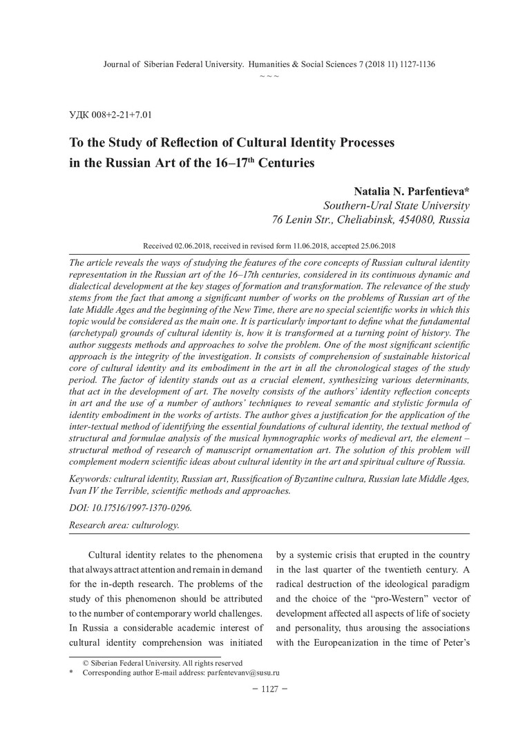 Библиографическое описание:Parfentieva, Natalia. To the Study of Reflection of Cultural Identity Processes in the Russian Art of the 16–17th Centuries = К проблеме изучения отражения идентичности в русском искусстве XVI–XVII вв. / N. N. Parfentieva. - Текст : непосредственный // Журнал Сибирского федерального университета. Гуманитарные науки. - 2018. - Т. 11, № 7. - С. 1127-1136. - Библиогр.: с. 1134-1136. - ISSN 1997-1370.