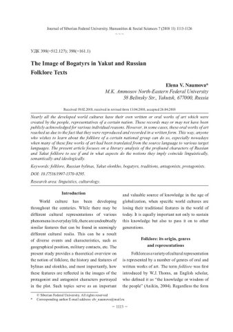 Библиографическое описание:Naumova, Elena. The Image of Bogatyrs in Yakut and Russian Folklore Texts = Образ богатырей в якутских и русских фольклорных текстах / E. V. Naumova. - Текст : непосредственный // Журнал Сибирского федерального университета. Гуманитарные науки. - 2018. - Т. 11, № 7. - С. 1113-1126. - Библиогр.: с. 1125-1126. - ISSN 1997-1370.