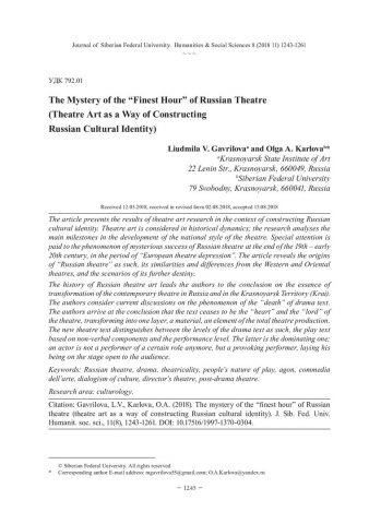 Библиографическое описание:Gavrilova, Liudmila. The Mystery of the "Finest Hour" of Russian Theatre (Theatre Art as a Way of Constructing Russian Cultural Identity) = Загадка "звездного часа" русского театра (театральное искусство как форма конструирования русской культурной идентичности) / L. V. Gavrilova, O. A. Karlova. - Текст : непосредственный // Журнал Сибирского федерального университета. Гуманитарные науки. - 2018. - Т. 11, № 8. - С. 1243-1261. - Библиогр.: с. 1258-1261. - ISSN 1997-1370.