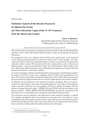 Библиографическое описание:Baranov, Victor. Statistical Analysis of the Slavonic Paraenesis by Ephrem the Syrian (on Three Electronic Copies of the 13–14th Centuries from the Manuscript Corpus) = Опыт статистического анализа славянского Паренесиса Ефрема Сирина (на материале электронной коллекции трех списков XIII–XIV вв. корпуса «Манускрипт») / V. A. Baranov. - Текст : непосредственный // Журнал Сибирского федерального университета. Гуманитарные науки. - 2018. - Т. 11, № 8. - С. 1211-1228. - Библиогр.: с. 1223-1228. - ISSN 1997-1370.