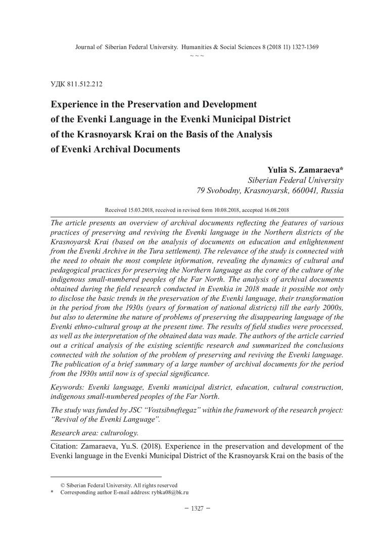 Библиографическое описание:Zamaraeva, Yulia. Experience in the Preservation and Development of the Evenki Language in the Evenki Municipal District of the Krasnoyarsk Krai on the Basis of the Analysis of Evenki Archival Documents = Опыт сохранения и развития эвенкийского языка в Эвенкийском муниципальном районе Красноярского края на материале анализа архивных документов Эвенкийского архива / Yu. S. Zamaraeva. - Текст : непосредственный // Журнал Сибирского федерального университета. Гуманитарные науки. - 2018. - Т. 11, № 8. - С. 1327-1369. - Библиогр.: с. 1356-1369. - ISSN 1997-1370.