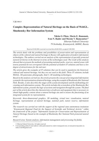 Библиографическое описание:Complex Representation of Natural Heritage on the Basis of WebGL. Shushensky Bor Information System = Комплексная репрезентация природного наследия на основе WebGL. Информационная система "Шушенский бор" / N. O. Pikov [и др.]. - Текст : непосредственный // Журнал Сибирского федерального университета. Гуманитарные науки. - 2018. - Т. 11, № 8. - С. 1315-1326. - Библиогр.: с. 1324-1326. - ISSN 1997-1370.