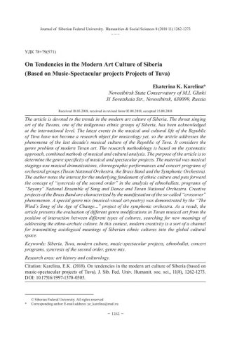 Библиографическое описание:Karelina, Ekaterina. On Tendencies in the Modern Art Culture of Siberia (Based on Music-Spectacular projects Projects of Tuva) = О тенденциях современной художественной культуры Сибири (на материале музыкально-зрелищных проектов Тувы) / E. K. Karelina. - Текст : непосредственный // Журнал Сибирского федерального университета. Гуманитарные науки. - 2018. - Т. 11, № 8. - С. 1262-1273. - Библиогр.: с. 1271-1273. - ISSN 1997-1370.