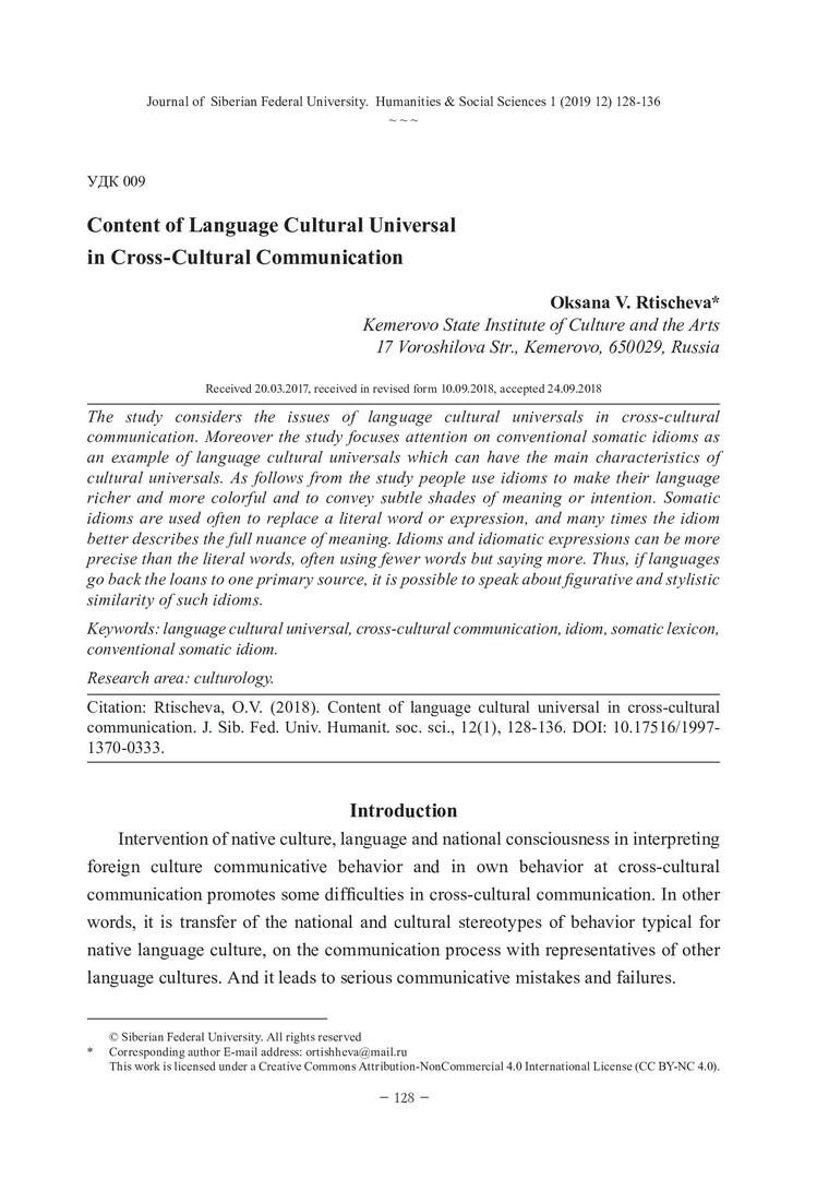 Библиографическое описание:Rtisheva, Oksana. Content of Language Cultural Universal in Cross-Cultural Communication = Содержание языковых культурных универсалий в межкультурной коммуникации / O. V. Rtisheva. - Текст : непосредственный // Журнал Сибирского федерального университета. Гуманитарные науки. - 2019. - Т. 12, № 1. - С. 128-136. - Библиогр.: с. 135-136. - ISSN 1997-1370.