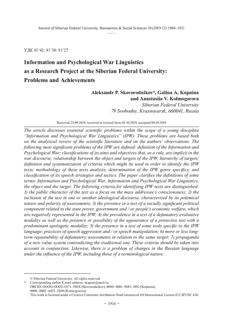 Библиографическое описание:Skovorodnikov, Aleksandr. Information and Psychological War Linguistics as a Research Project at the Siberian Federal University: Problems and Achievements = Лингвистика информационно-психологической войны как научно-исследовательский проект в Сибирском федеральном университете / проблематика и достижения / A. P. Skovorodnikov , G. A. Kopnina, A. V. Kolmogorova. - Текст : непосредственный // Журнал Сибирского федерального университета. Гуманитарные науки. - 2019. - Т. 12, № 10. - С. 1904-1921. - Библиогр.: с. 1914-1921. - ISSN 1997-1370.