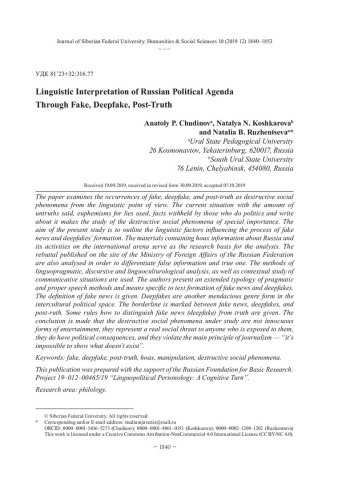 Библиографическое описание:Chudinov, Anatoly. Linguistic Interpretation of Russian Political Agenda Through Fake, Deepfake, Post-Truth = Лингвистическая интерпретация политики России через призму фейка, дипфейка, постправды / A. P. Chudinov, N. N. Koshkarova , N. B. Ruzhentseva. - Текст : непосредственный // Журнал Сибирского федерального университета. Гуманитарные науки. - 2019. - Т. 12, № 10. - С. 1840-1853. - Библиогр.: с. 1851-1853. - ISSN 1997-1370.
