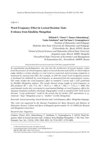 Библиографическое описание:Word Frequency Effect in Lexical Decision Task: Evidence from Khalkha Mongolian = Эффект частотности слова в задании на лексическое решение: экспериментальные доказательства на материале халха-монгольского языка / M. S. Vlasov [и др.]. - Текст : непосредственный // Журнал Сибирского федерального университета. Гуманитарные науки. - 2019. - Т. 12, № 10. - С. 1954-1964. - Библиогр.: с. 1961-1964. - ISSN 1997-1370.