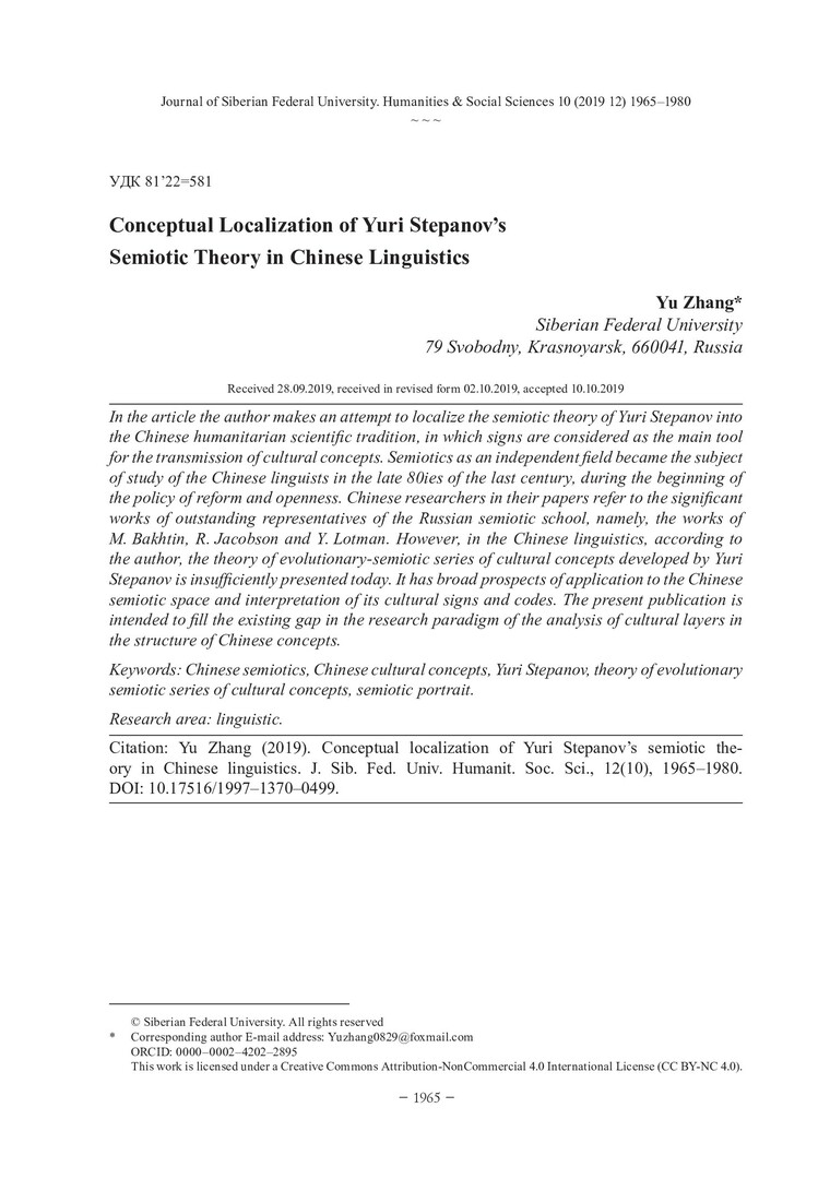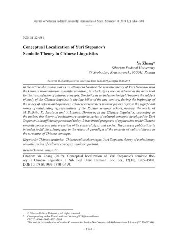Библиографическое описание:Yu Zhang. Conceptual Localization of Yuri Stepanov`s Semiotic Theory in Chinese Linguistics = Концептуальная локализация понятий семиотической теории Ю. Степанова в китайском языкознании / Yu Zhang. - Текст : непосредственный // Журнал Сибирского федерального университета. Гуманитарные науки. - 2019. - Т. 12, № 10. - С. 1965-1980. - Библиогр.: с. 1977-1980. - ISSN 1997-1370.
