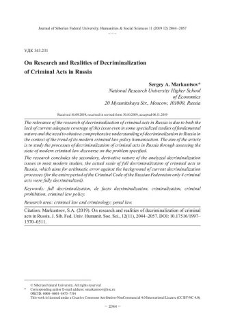 Библиографическое описание:Markuntsov, Sergey. On Research and Realities of Decriminalization of Criminal Acts in Russia = К вопросу об исследовании и реалиях декриминализации преступных деяний в России / S. A. Markuntsov. - Текст : непосредственный // Журнал Сибирского федерального университета. Гуманитарные науки. - 2019. - Т. 12, № 11. - C. 2044-2057. - Библиогр.: с. 2054-2057. - ISSN 1997-1370.
