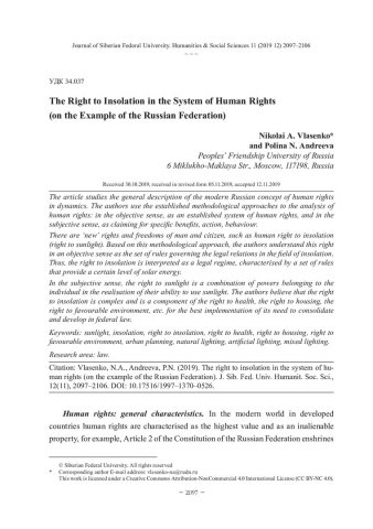 Библиографическое описание:Vlasenko, Nikolai. The Right to Insolation in the System of Human Rights (on the Example of the Russian Federation) = Право на инсоляцию в системе прав человека (на примере Российской Федерации) / N. A. Vlasenko, P. N. Andreeva. - Текст : непосредственный // Журнал Сибирского федерального университета. Гуманитарные науки. - 2019. - Т. 12, № 11. - C. 2097-2106. - Библиогр.: с. 2104. - ISSN 1997-1370.