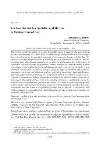 Библиографическое описание:Petrov, Aleksandr. Lex Posterior and Lex Specialis Legal Maxims in Russian Criminal Law = Коллизионные максимы lex posterior и lex specialis в отраслевом преломлении: на опыте уголовного права России / A. A. Petrov. - Текст : непосредственный // Журнал Сибирского федерального университета. Гуманитарные науки. - 2019. - Т. 12, № 11. - C. 2058-2078. - Библиогр.: с. 2075-2078. - ISSN 1997-1370.
