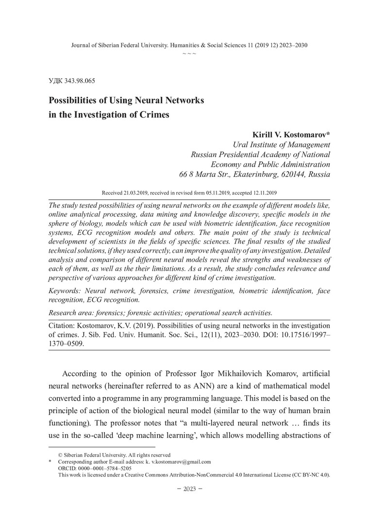 Библиографическое описание:Kostomarov, Kirill. Possibilities of Using Neural Networks in the Investigation of Crimes = Возможности использования нейронных сетей при расследовании преступлений / K. V. Kostomarov. - Текст : непосредственный // Журнал Сибирского федерального университета. Гуманитарные науки. - 2019. - Т. 12, № 11. - C. 2023-2030. - Библиогр.: с. 2028-2030. - ISSN 1997-1370.