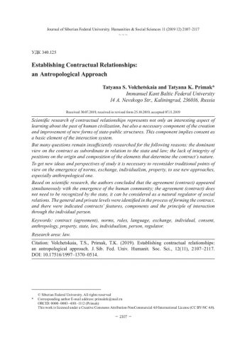 Библиографическое описание:Volchetskaia, Tatyana. Establishing Contractual Relationships: an Antropological Approach = Формирование договорных отношений: антропологический подход / T. S. Volchetskaia, T. K. Primak. - Текст : непосредственный // Журнал Сибирского федерального университета. Гуманитарные науки. - 2019. - Т. 12, № 11. - C. 2107-2117. - Библиогр.: с. 2116-2117. - ISSN 1997-1370.