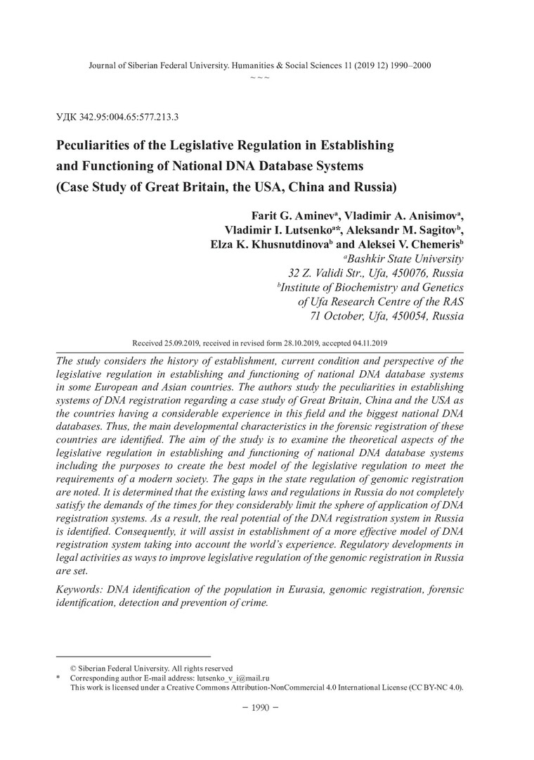 Библиографическое описание:Peculiarities of the Legislative Regulation in Establishing and Functioning of National DNA Database Systems (Case Study of Great Britain, the USA, China and Russia) = Особенности законодательной регламентации построения и функционирования систем национальных баз данных ДНК (на примере Великобритании, США, Китая и России) / F. G. Aminev [и др.]. - Текст : непосредственный // Журнал Сибирского федерального университета. Гуманитарные науки. - 2019. - Т. 12, № 11. - C. 1990-2000. - Библиогр.: с. 1998-2000. - ISSN 1997-1370.