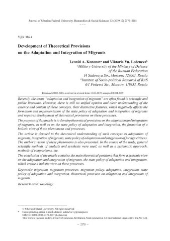 Библиографическое описание:Kononov, Leonid. Development of Theoretical Provisions on the Adaptation and Integration of Migrants = Развитие теоретических положений об адаптации и интеграции мигрантов / L. A. Kononov, V. Yu. Ledeneva. - Текст : непосредственный // Журнал Сибирского федерального университета. Гуманитарные науки. - 2019. - Т. 12, № 12. - С. 2170-2181. - Библиогр.: с. 2179-2181. - ISSN 1997-1370.