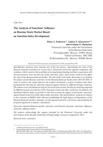 Библиографическое описание:Fedorova, Elena. The Analysis of Sanctions` Influence on Russian Stock Market Based on Sanction Index Development = Анализ влияния санкций на российский финансовый рынок на основе разработки санкционных индексов / E. A. Fedorova, L. E. Khrustova, S. O. Musienko. - Текст : непосредственный // Журнал Сибирского федерального университета. Гуманитарные науки. - 2019. - Т. 12, № 12. - С. 2155-2169. - Библиогр.: с. 2167-2169. - ISSN 1997-1370.