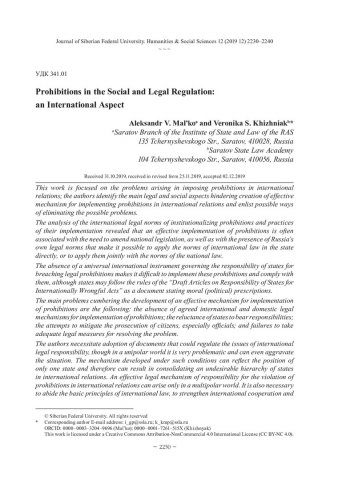 Библиографическое описание:Mal`ko, Aleksandr. Prohibitions in the Social and Legal Regulation: an International Aspect = Запреты в социально-правовом регулировании : международный аспект / A. V. Mal`ko, V. S. Khizhniak. - Текст : непосредственный // Журнал Сибирского федерального университета. Гуманитарные науки. - 2019. - Т. 12, № 12. - С. 2230-2240. - Библиогр.: с. 2237-2240. - ISSN 1997-1370.