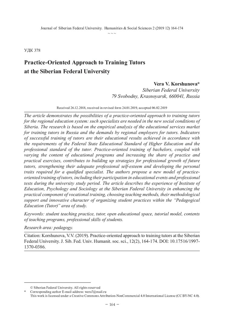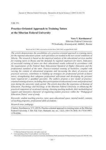 Библиографическое описание:Korshunova, Vera. Practice-Oriented Approach to Training Tutors at the Siberian Federal University = Практико-ориентированный подход к обучению тьюторов в Сибирском федеральном университете / V. V. Korshunova. - Текст : непосредственный // Журнал Сибирского федерального университета. Гуманитарные науки. - 2019. - Т. 12, № 2. - С. 164-174. - Библиогр.: с. 172-174. - ISSN 1997-1370.